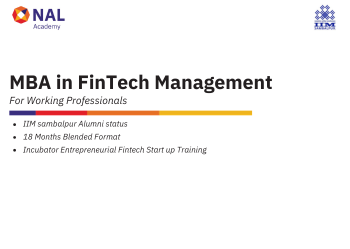 The FinTech industry in India is rapidly advancing due to the latest technological innovations. As a result, to help professionals in Banking, Consulting, Financial Services, Insurance, Management, and Technology fields stay ahead of the FinTech Revolution, IIM Sambalpur, in collaboration with NAL Academy, is offering a 18-Month Degree Program.